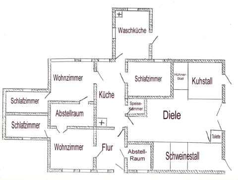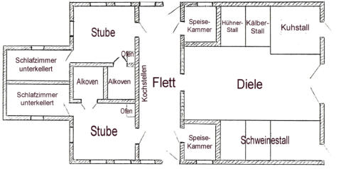 Schweineställe und darüber ein großer Kornboden, eine große Diele, eine Strohbanse und für einen Hühnerstall. Im Keller unter